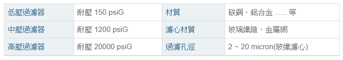材 質︰碳鋼、鋁合金 ...... 等濾心材質︰玻璃纖維、金屬網過濾孔徑︰2 ~ 20 micron(玻纖濾心)PDF下載